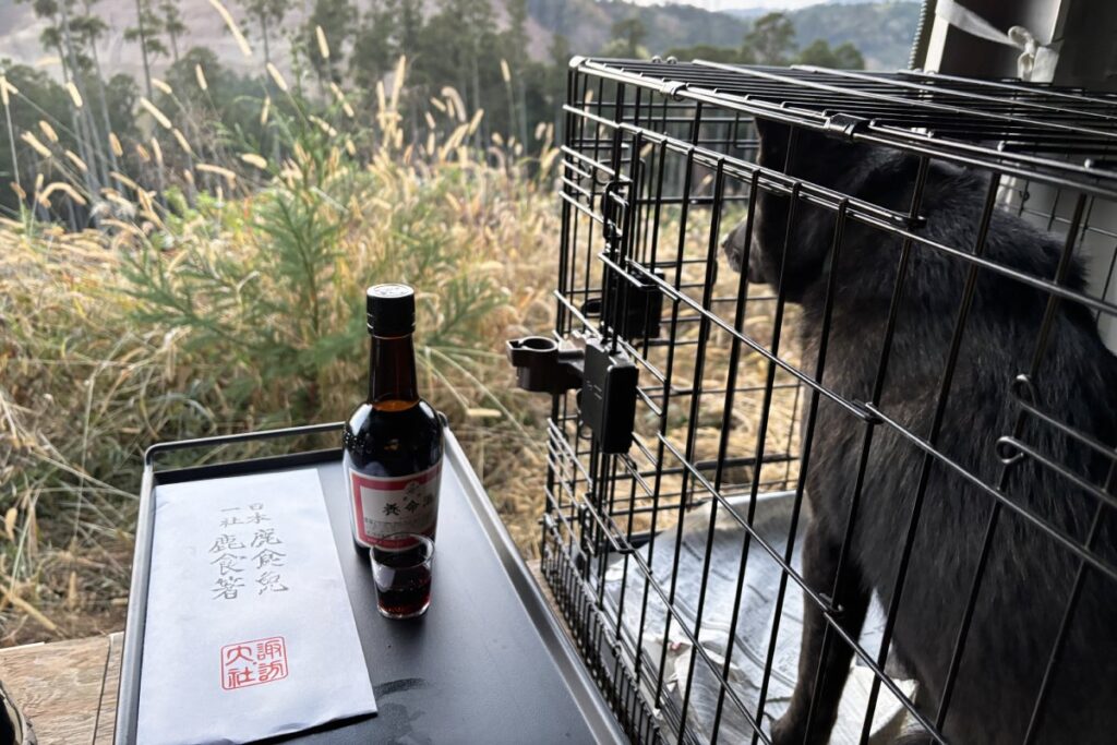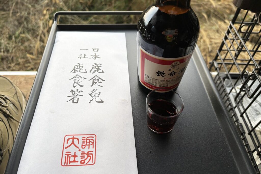 夜明け後(この日は6:15)から狩猟ができるようになるのですが、それより早く林道に車を止めて山に免罪符とお酒をお供えしてからスタートすることにしました。