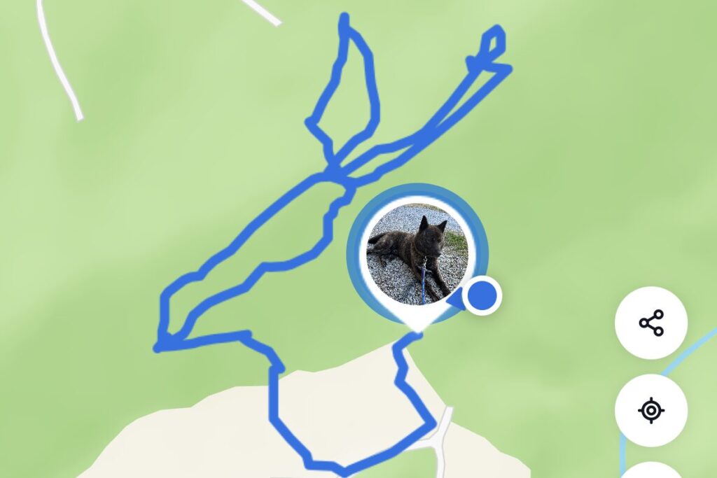 ドッグマーカーは高くて手が出ないので、海外の犬用GPSを付けてみていました。リアルタイムで動きが見えるのですが、これがまあまあ優秀です。ただ、山の中だと電波が届かなくて途切れることもしばしば…。