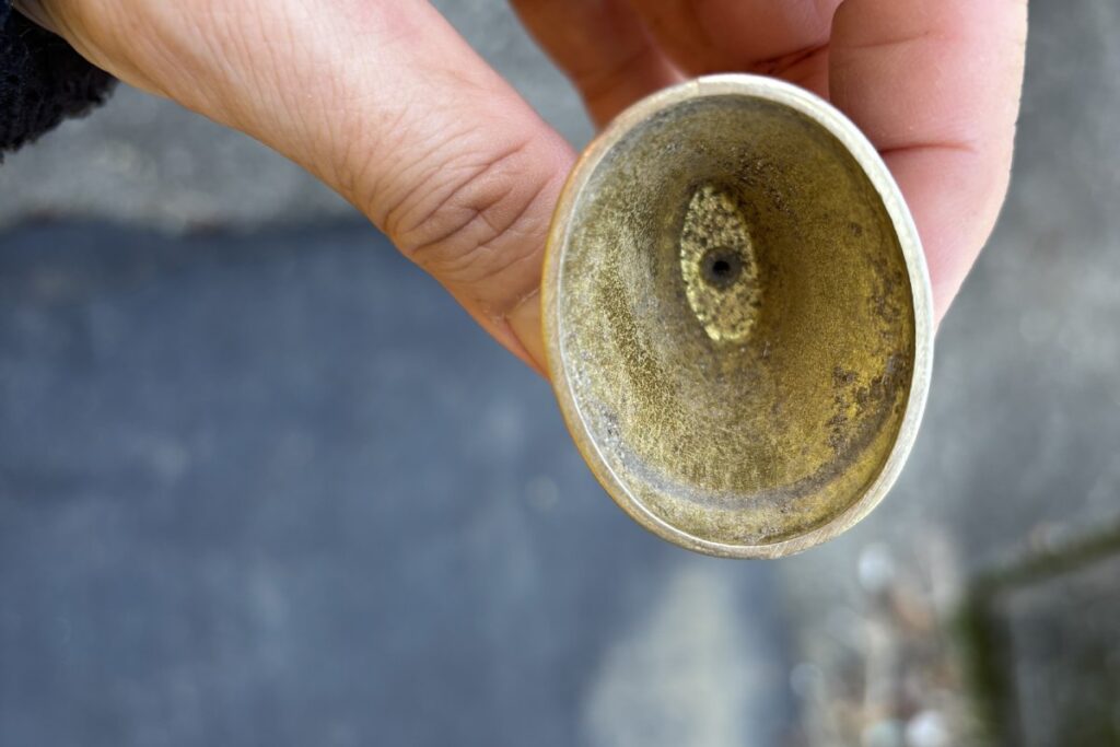 途中から音がしなくなったけど、落としたのかなと思ったら……器用に壊れていました。どうやったら舌(というらしい、中で揺れて音を出す部分)だけ取れるのさ。よほど何かに夢中になって激しく動いていたようです。