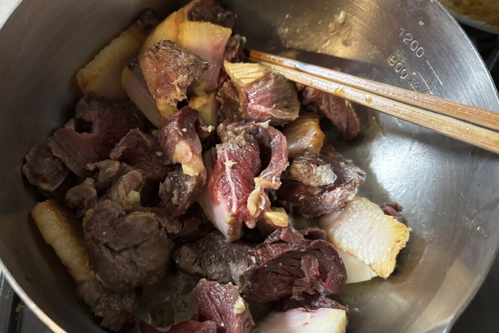 残りのクマ肉も入れ、すり下ろしたショウガを入れてクマの脂でちょっと炒めます。