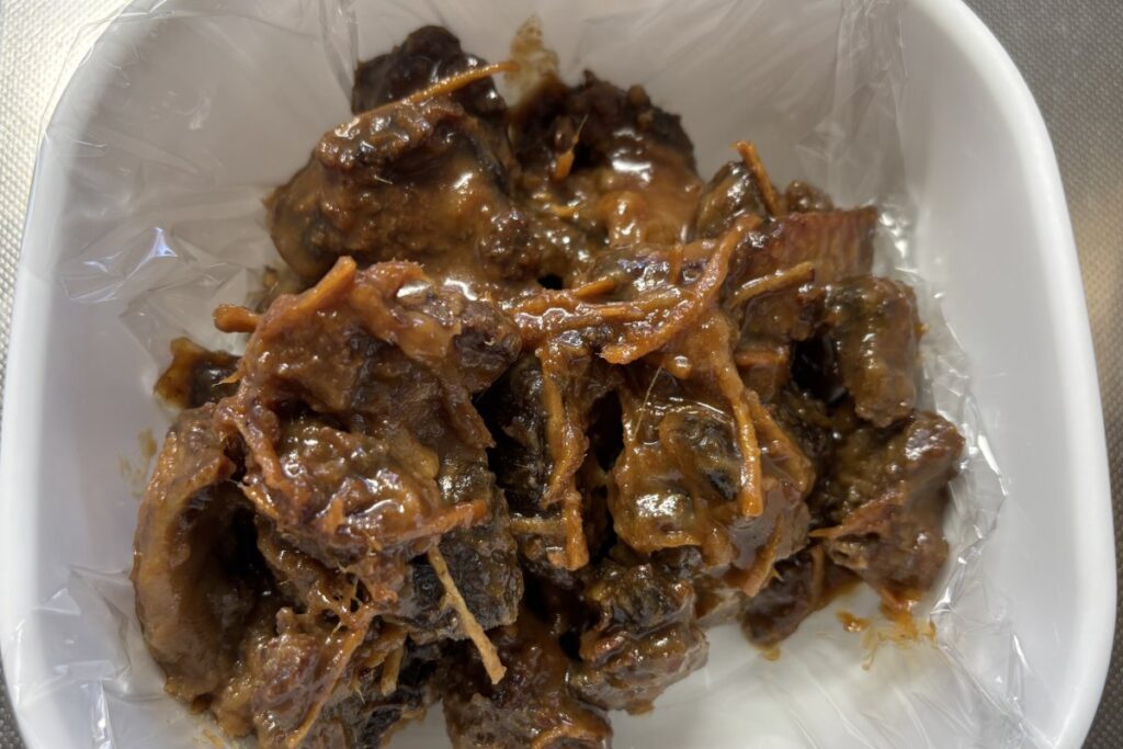 完成。脂がすごいので、タッパーにラップを敷いてから保存します。