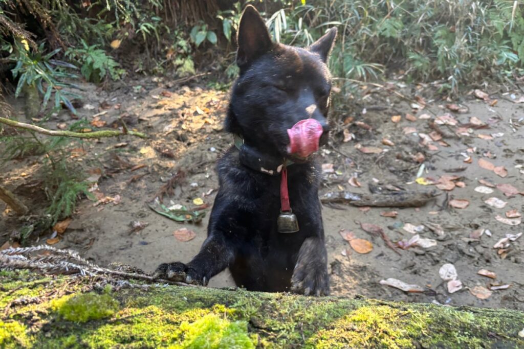本日もお供はサクラ。この日は鹿?の、ほぼ肉塊だけになった死体がくさむらに落ちていたり、小さな獣に執着して竹藪から離れなかったりで落ち着きがありませんでした。