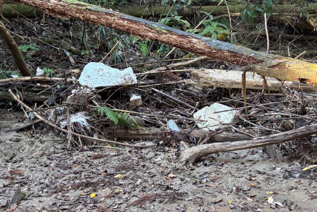 下の写真は上の拡大。発泡スチロール、ビン、缶、陶器、プラスチックなどいろいろなゴミが……。
